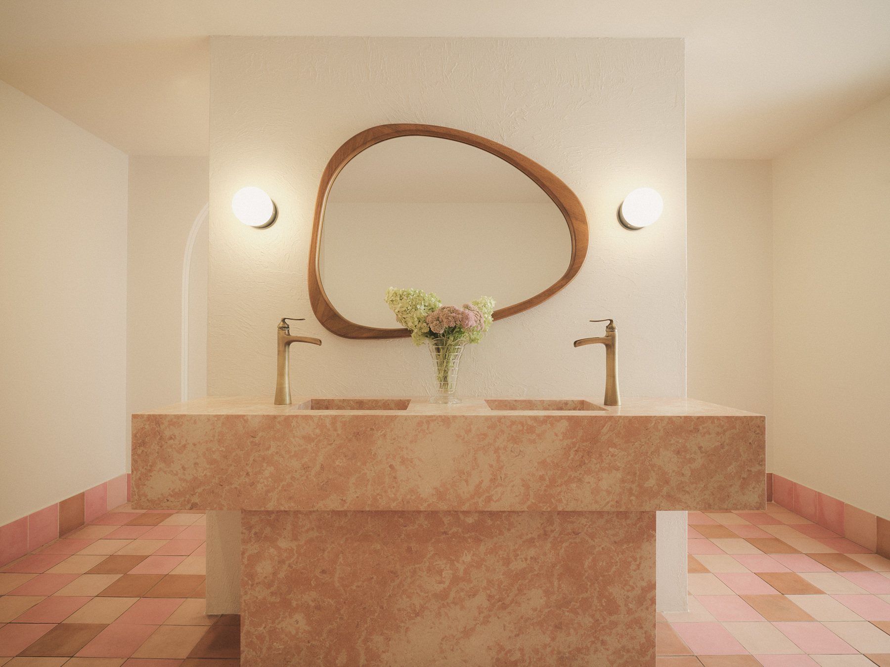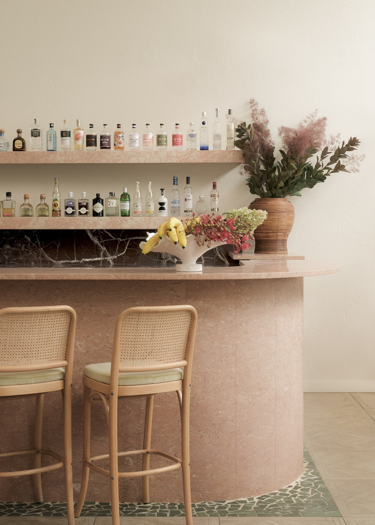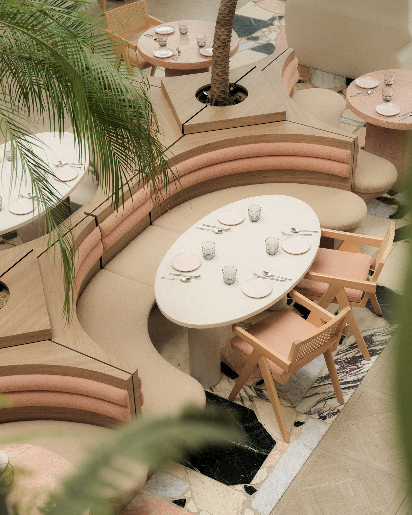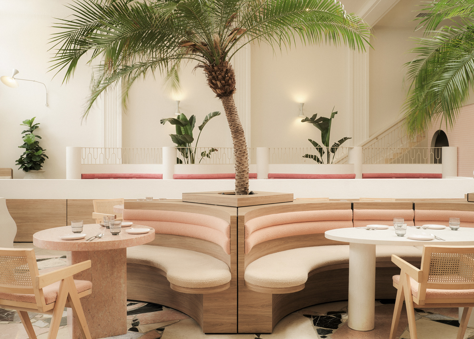 Curved forms anchor the layout, softened by layered textures and generous planting. A central bar acts as a focal point within the room, while custom seating and communal tables are arranged to support both lively gatherings and more relaxed moments. Bold material choices are balanced with natural light and considered proportions, allowing the interior to feel expressive without overwhelming.