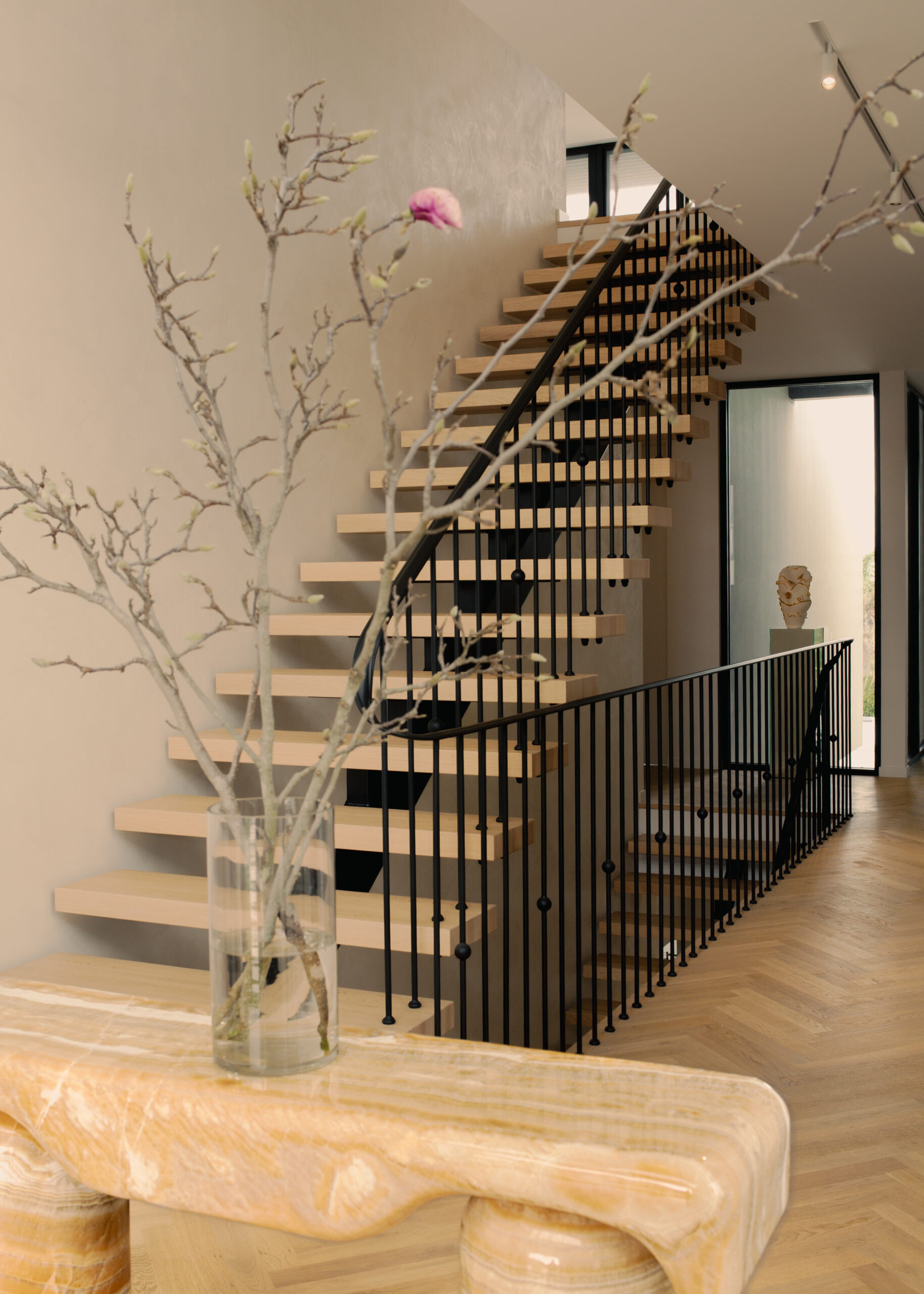 The home unfolds level by level, with each space offering its own atmosphere while remaining part of a cohesive whole. Materials are used with intention – tactile finishes, crafted details, and subtle shifts in tone create depth without ever feeling overstated.